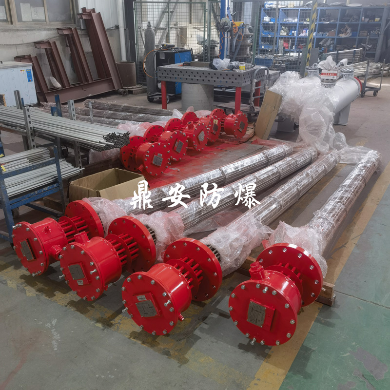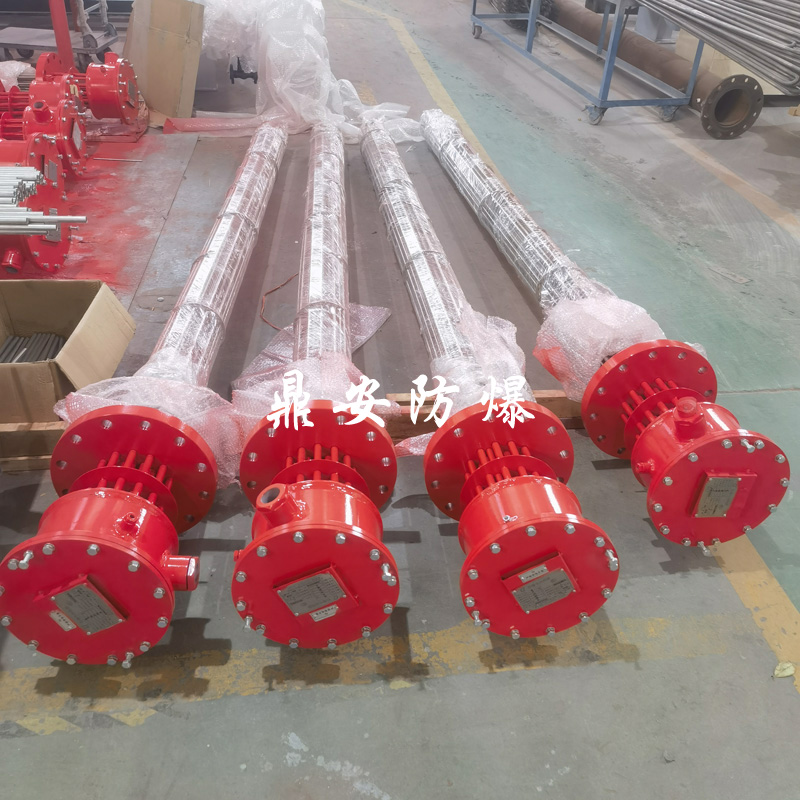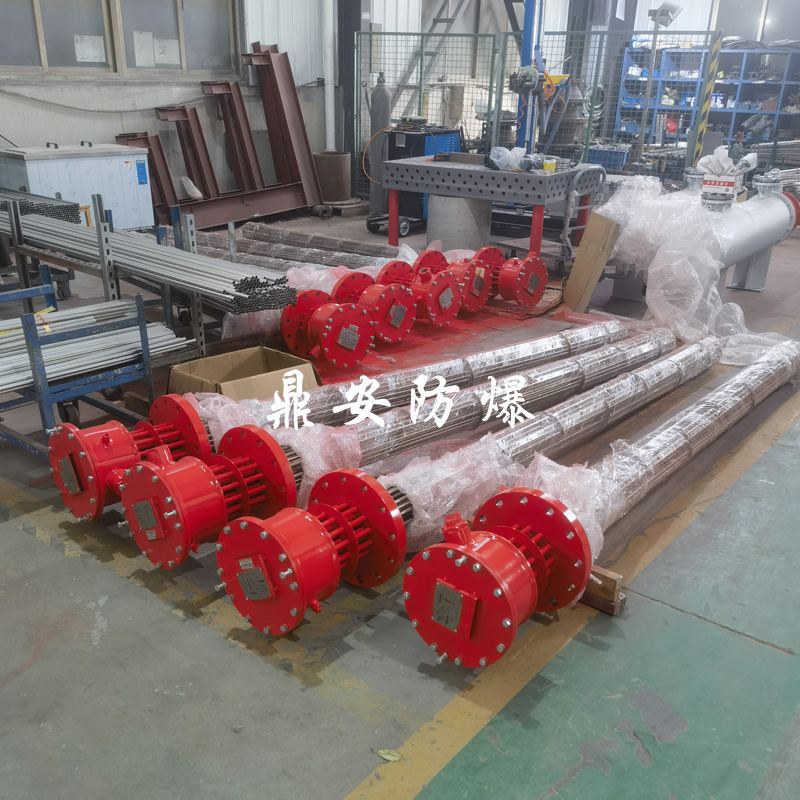 防爆法蘭電加熱管(也稱插入式電加熱器):是采用U型管狀電熱元件,依據加熱不同介質設計規范,按照功率配置要求裝配在法蘭蓋上,插入需加熱物料中,發熱元件工作時所發出的大量熱量傳導給被加熱介質使介質溫度升高,達到所需的工藝要求。當介質溫度達到工藝要求的設定值時,控制系統根據溫度傳感器信號,經PID 運算后調節電加熱器輸出功率,對發熱元件的電阻性負載實現溫度控制。使介質溫度均勻,達到所需要求;當發熱元件超溫或低液位時,發熱元件的聯鎖保護裝置立即切斷加熱電源避免發熱元件燒壞,延長使用壽命。