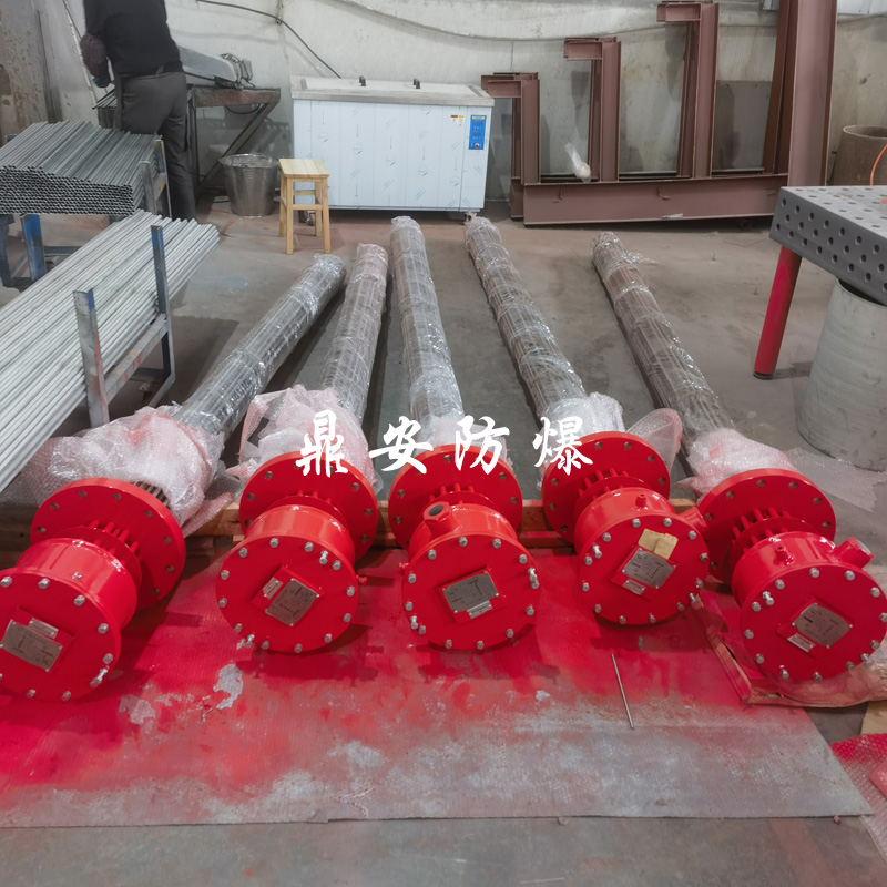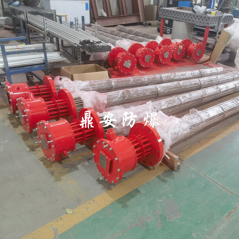 防爆法蘭加熱管是由多支加熱管焊接在法蘭上集中加熱。主要用于敞開式、封閉式的溶液箱和循環系統中加熱用。優點: 表面功率大,使一般電加熱表面負荷的2~4倍,高度密集式、結構緊湊。由于整體短而密集,故穩定性好,安裝無需支架。組合式法蘭加熱管大多采用氬弧焊接方式使電熱管于法蘭連接,也可利用緊固裝置的形式,即每支電熱管上焊由緊固件。然后與法蘭蓋采用螺母鎖緊。管子于緊固件采用氬弧焊接。緊固件密封處采用科學的工藝。單支更換方便,大大節約以后的維修成本選擇進口及國內優質材料。科學的生產工藝,嚴格的質量管理,保證電熱管優越的電氣性能。