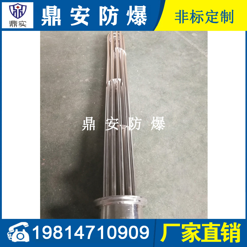 法蘭電熱管(也稱插入式電加熱器):是采用U型管狀電熱元件,多支U型電熱管焊接在法蘭上集中加熱,依據(jù)加熱不同介質(zhì)設(shè)計(jì)規(guī)范,按照功率配置要求裝配在法蘭蓋上,插入需加熱物料中,發(fā)熱元件工作時(shí)所發(fā)出的大量熱量傳導(dǎo)給被加熱介質(zhì)使介質(zhì)溫度升高,達(dá)到所需的工藝要求,主要用于敞開式、封閉式的溶液箱和循環(huán)系統(tǒng)中加熱用。