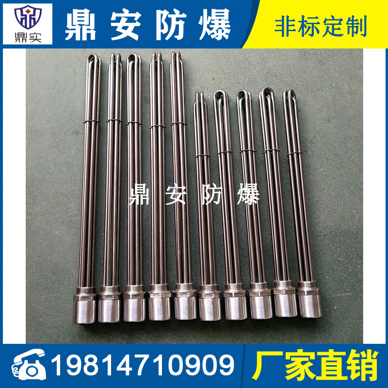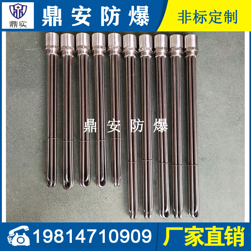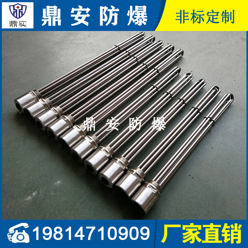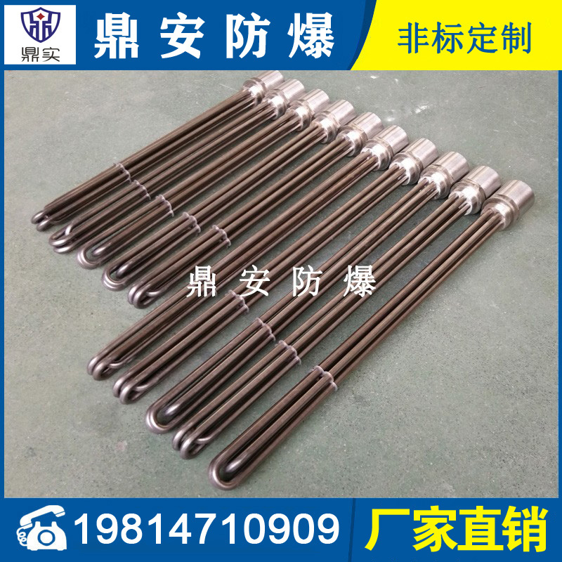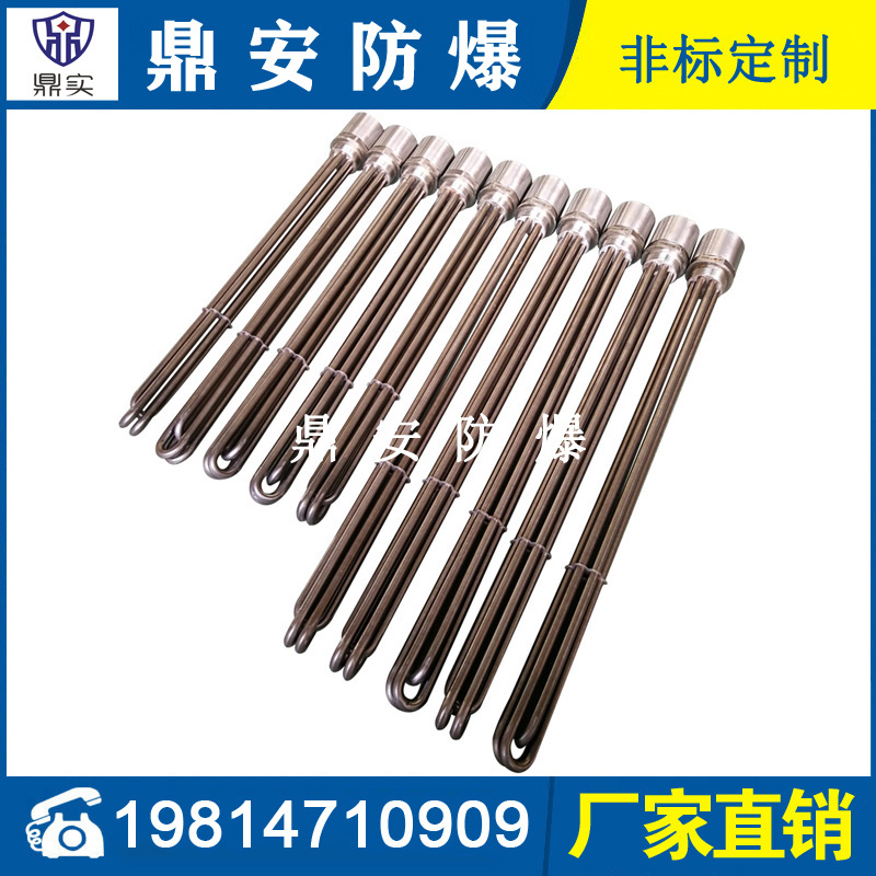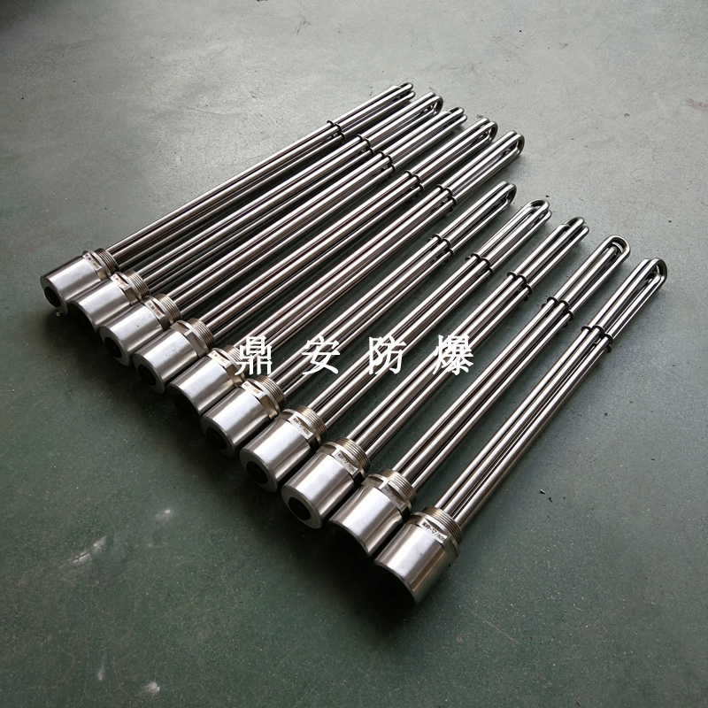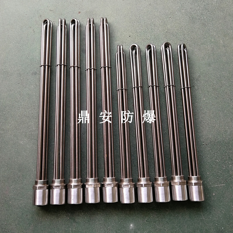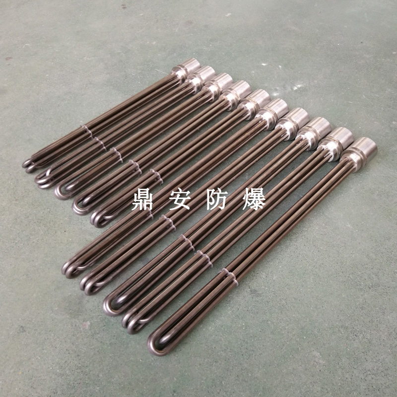 法蘭電熱管(也稱插入式電加熱器):是采用U型管狀電熱元件,多支U型電熱管焊接在法蘭上集中加熱,依據(jù)加熱不同介質(zhì)設計規(guī)范,按照功率配置要求裝配在法蘭蓋上,插入需加熱物料中,發(fā)熱元件工作時所發(fā)出的大量熱量傳導給被加熱介質(zhì)使介質(zhì)溫度升高,達到所需的工藝要求,主要用于敞開式、封閉式的溶液箱和循環(huán)系統(tǒng)中加熱用。