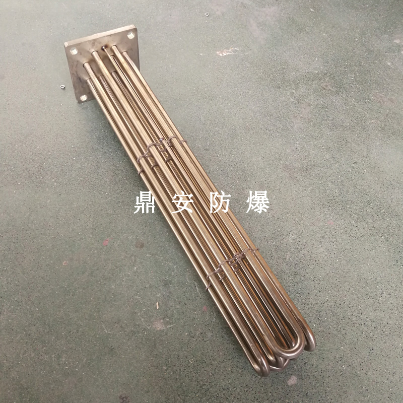 法蘭電熱管(也稱插入式電加熱器):是采用U型管狀電熱元件,多支U型電熱管焊接在法蘭上集中加熱,依據加熱不同介質設計規范,按照功率配置要求裝配在法蘭蓋上,插入需加熱物料中,發熱元件工作時所發出的大量熱量傳導給被加熱介質使介質溫度升高,達到所需的工藝要求,主要用于敞開式、封閉式的溶液箱和循環系統中加熱用。