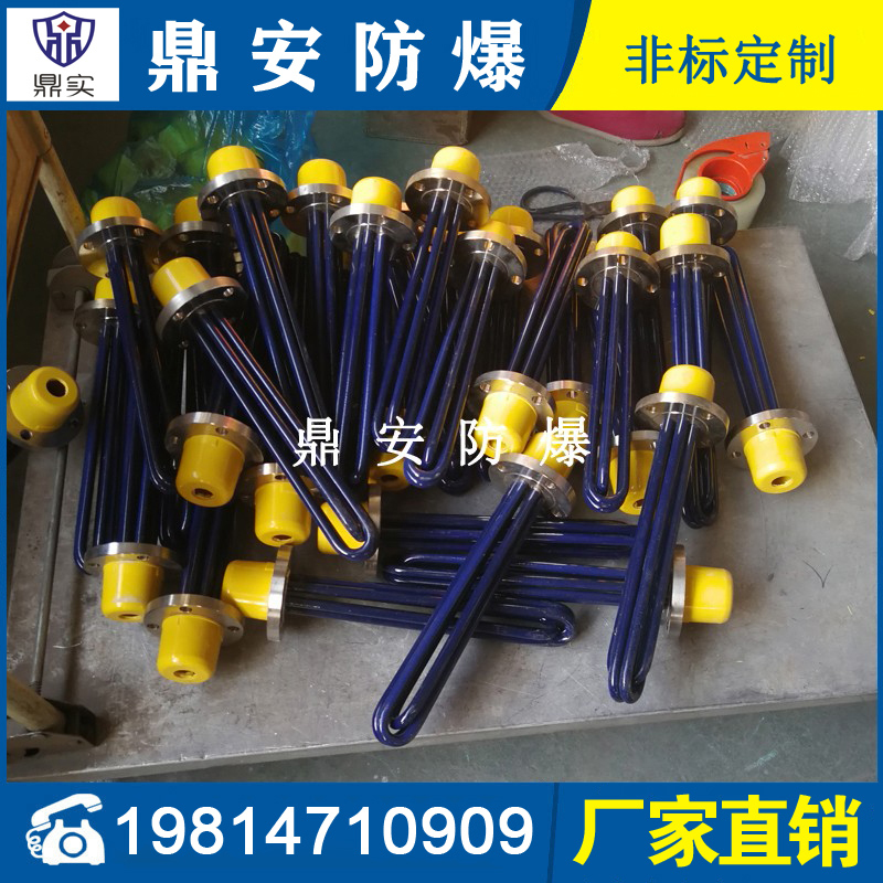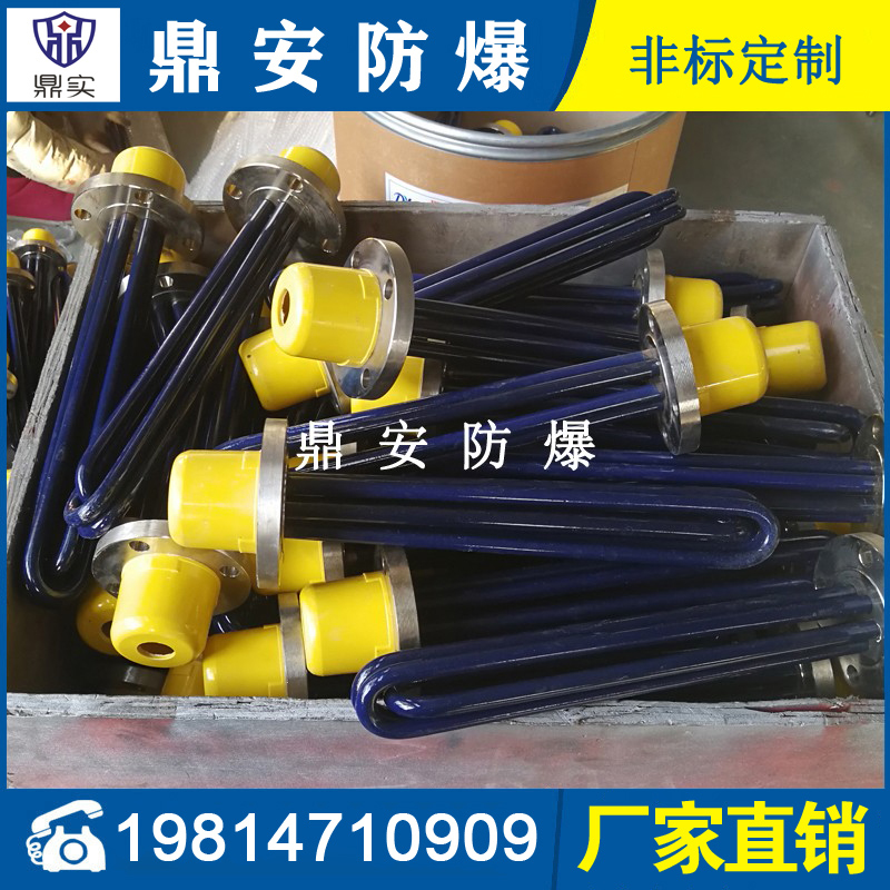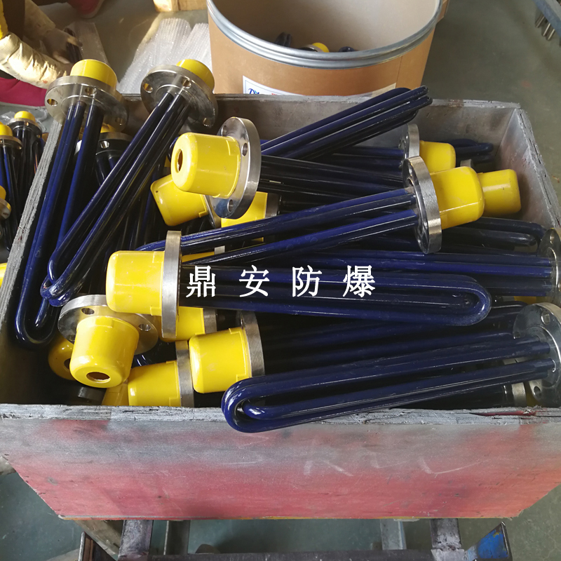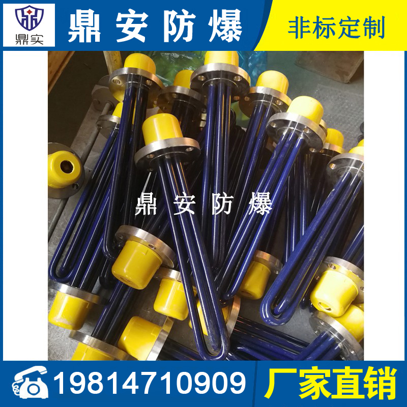 法蘭電熱管(也稱插入式電加熱器):是采用U型管狀電熱元件,多支U型電熱管焊接在法蘭上集中加熱,依據加熱不同介質設計規范,按照功率配置要求裝配在法蘭蓋上,插入需加熱物料中,發熱元件工作時所發出的大量熱量傳導給被加熱介質使介質溫度升高,達到所需的工藝要求,主要用于敞開式、封閉式的溶液箱和循環系統中加熱用。