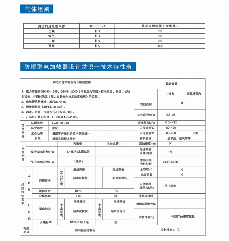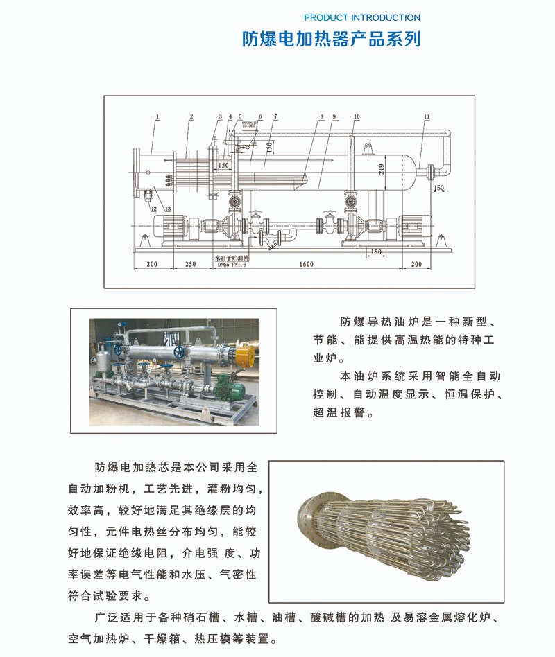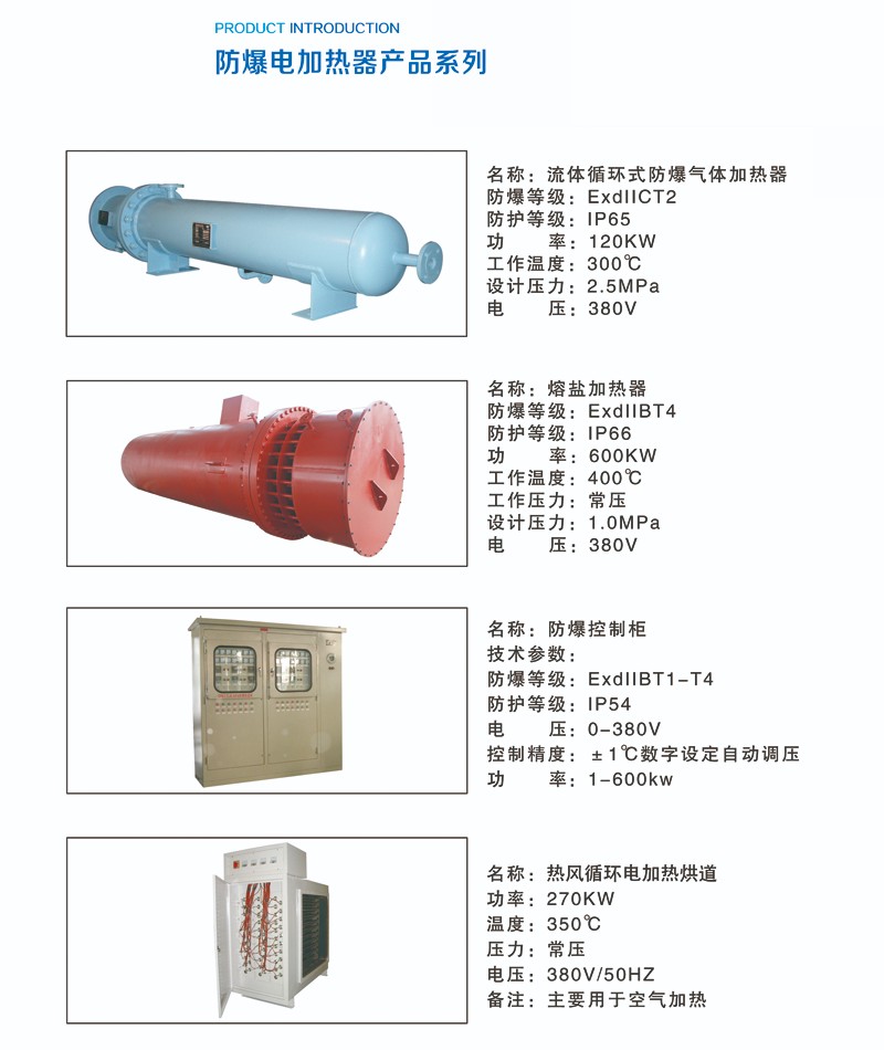 電加熱器,液體防爆電加熱器,防爆型天然氣加熱器,防爆乙炔氣電加熱器,防爆型氫氣電加熱器,防爆型甲醇加熱器,防爆二甲醚電加熱器,防爆導(dǎo)熱油電加熱器(導(dǎo)熱油爐,有機熱載體系統(tǒng)),防爆原油、重油(燃料油)、稠液電加熱器 ,防爆(普通)貯油罐電加熱器。